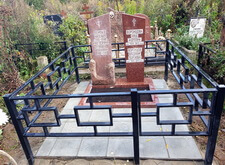 Клиент пожелал сохранить старое надгробье, а потому его мы попросту переустановили, параллельно с этим установив по периметру участка простую металлическую оградку. Все работы велись строго по уровню, а потому перекосы ограждения или надгробья абсолютно исключены.