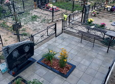 Изначальное состояние места захоронения – отсыпанный песком участок. Клиентку не устраивало подобное наземное покрытие: сложное в уборке и не очень привлекательное внешне. Заказчица пожелала заложить могилу бетонной плиткой, сохранив два цветника.